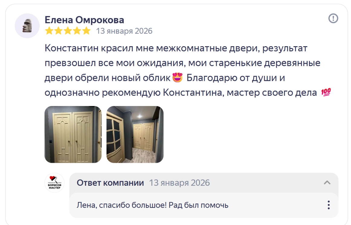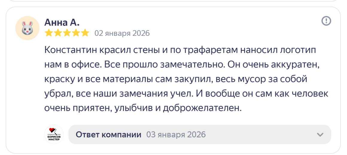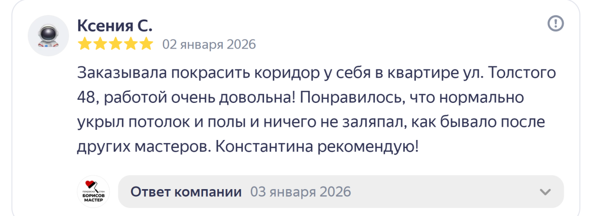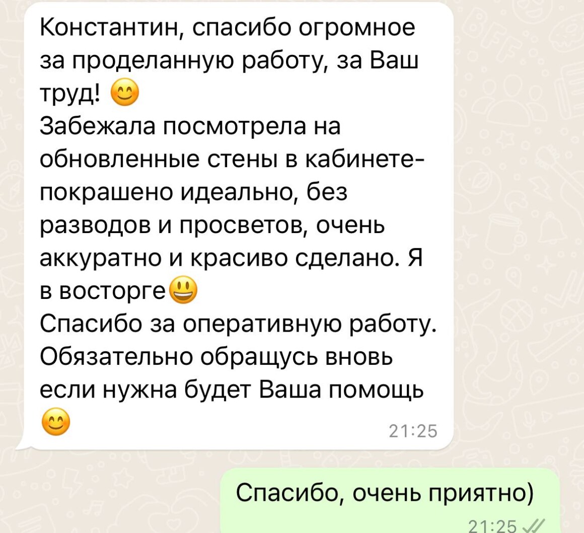 Опыт работы маляром более 5 лет. Более 450 довольных клиентов. Открашено свыше 5000 квадратных метров стен и потолков. Работаю и с людьми, и с организациями.